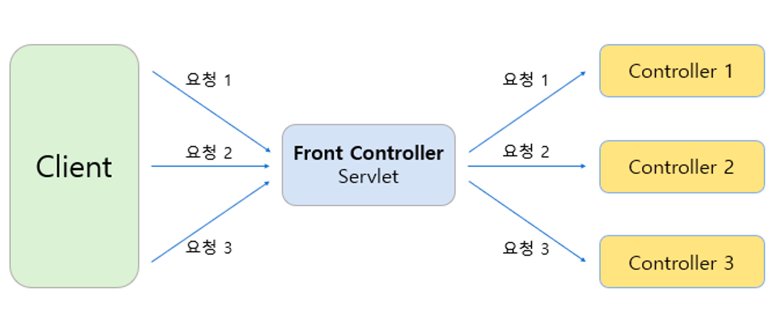 서블릿이 중복되는 코드들을 가지지 않도록, 중복된 코드(매핑, 응답 생성, 공통 처리)를 Front Controller라는 이름을 가진 서블릿에게 할당하고 이 서블릿에서 url을 매핑하여 서블릿에게 개별 로직을 처리하도록 요청한다. 이때 서블릿은 중복되는 코드를 가지지 않고 응답에 필요한 비즈니스 로직만 가진다. 이 실행 로직은 Controller 이름의 POJO로 분리한다.