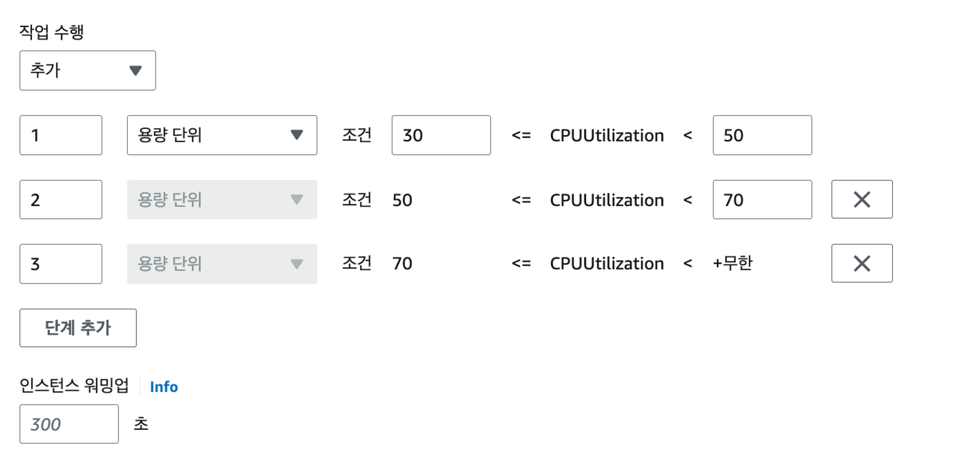 - 작업 추가 : CPUUtilization 지표값의 범위에 따라 추가할 인스턴스 용량 지정