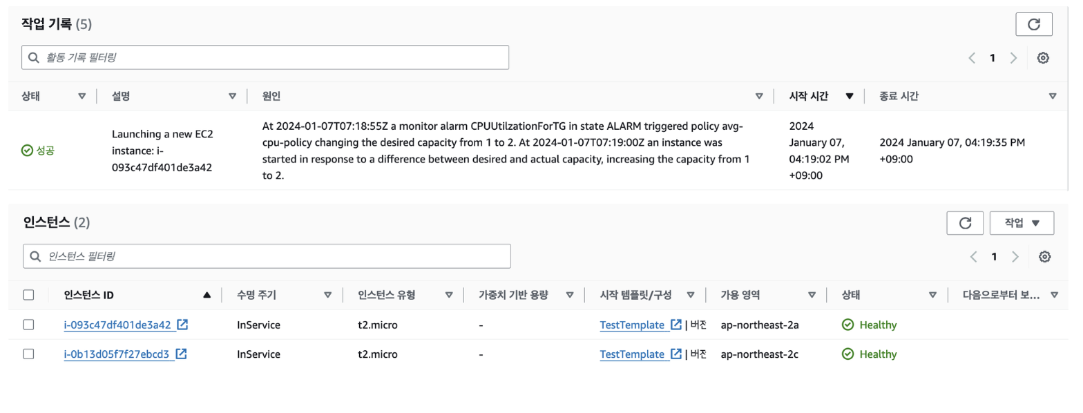 - 알람이 발생하여 스케일 아웃 수행. 새 인스턴스 시작까지 시간이 좀 걸린다.