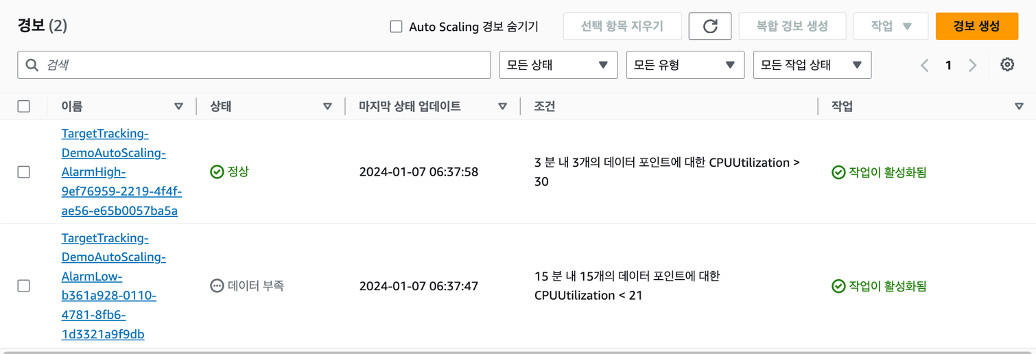 DemoAutoScaling 내 ec2의 평균 CPUUtilization이 30보다 크면 CPUUtilization 알람이 발생한다.