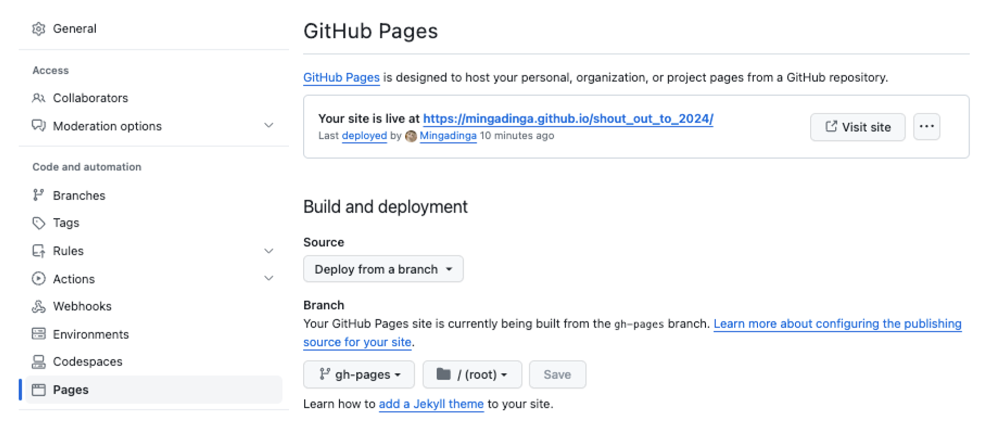 설정에서 브랜치를 gh-pages로 선택하고 저장하면 웹사이트가 배포된다.