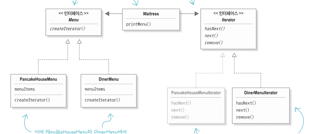 종업원은 Menu라는 인터페이스로 두 식당의 메뉴 객체에 접근할 수 있다. Menu 구현체들은 반복자 관련 구현체인 Iterator 객체를 반환한다. 각각 배열과 리스트에 맞는 Iterator을 반환하는데, 배열은 java util에서 제공하는 반복자가 없으므로 따로 생성해 반환한다.