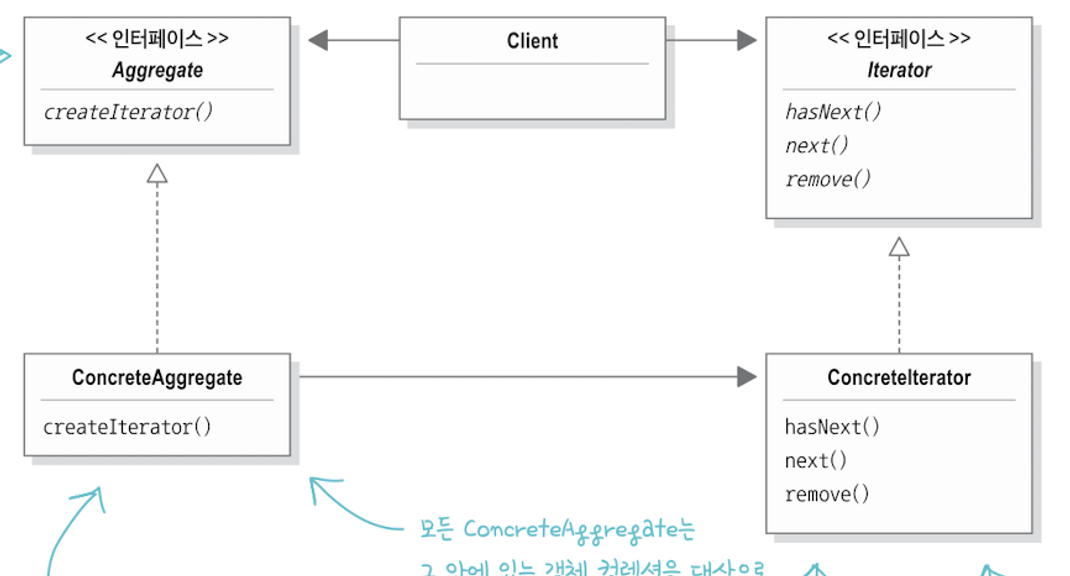 클라이언트가 사용하려고 하는 컬렉션과 그 부가기능을 제공하는 책임은 ConcreteAggregate에게 있으며, 여러 종류의 객체가 존재할 수 있으므로 Aggregate 인터페이스로 접근한다. ConcreteAggregate가 가진 컬렉션의 모든 항목을 접근할 수 있게 하는 기능은 ConcreteIterator에게 있다. ConcreteAggregate가 다른 컬렉션을 가지고 있을 수 있으므로 Iterator도 인터페이스로 접근한다.