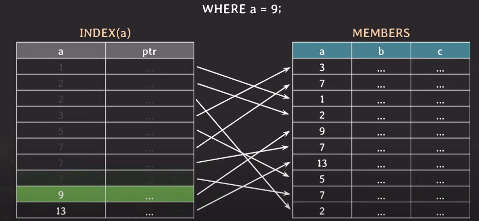 - where a = 9;을 실행할 때 Index(a)에서 이진 탐색으로 9를 빠르게 찾고, 9의 ptr가 가리키는 튜플을 찾아서 조회함