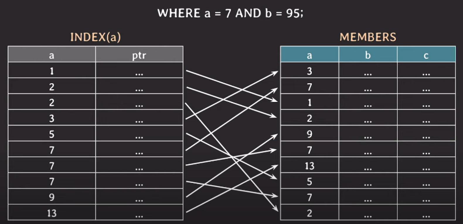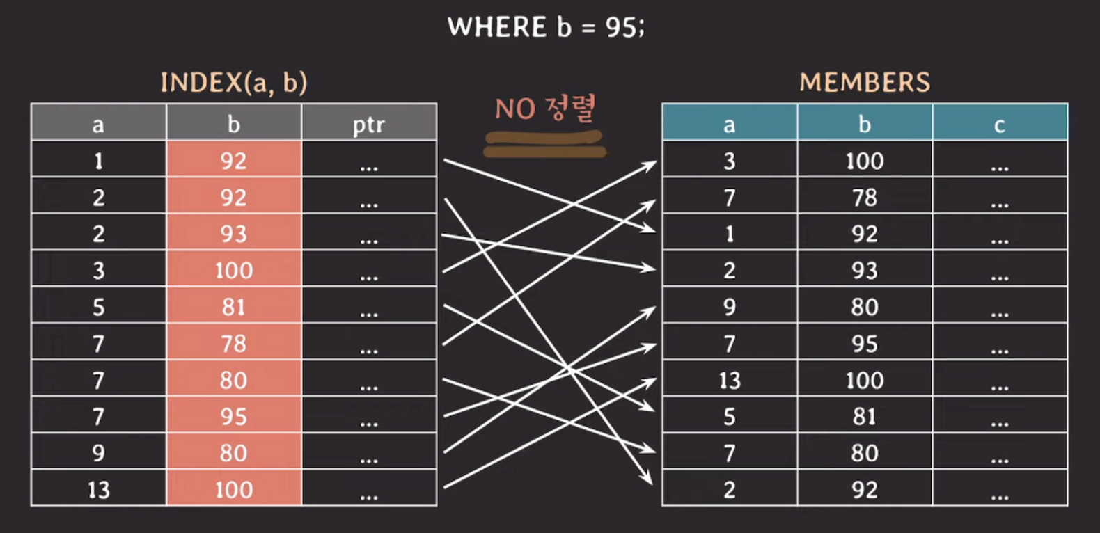 - Index에서 조건에 맞는 a를 찾으면 포인터로 튜플의 b를 추가 탐색한다. 만약 조건에 맞는 a로 찾은 포인터가 수천건이 넘는다면, 이 데이터에 대해 매번 조회해서 b를 비교해야한다.