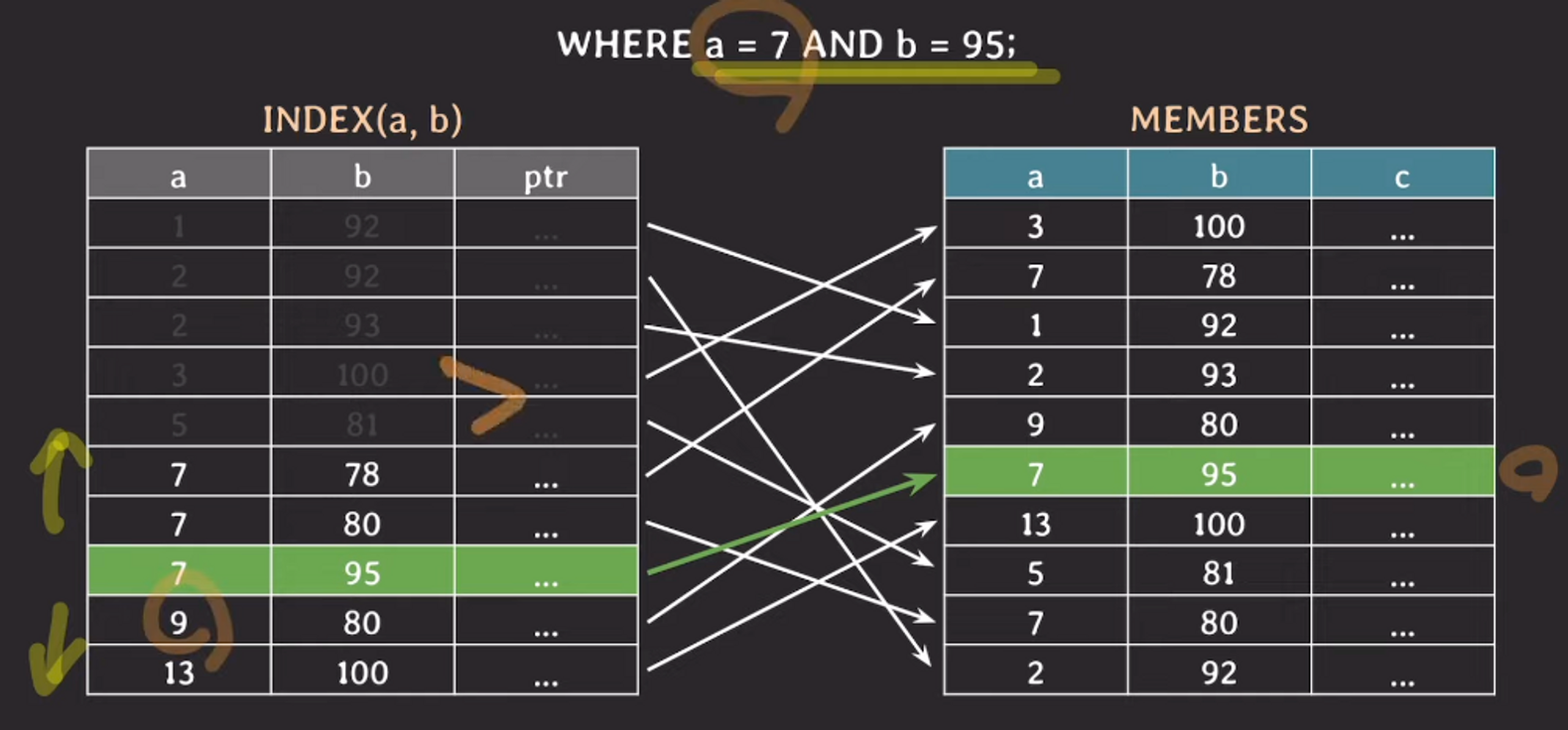 - 이진 탐색으로 a 조건에 맞는 Index 튜플을 찾으면 b 조건을 추가로 비교해서 맞으면 포인터로 연결된 튜플을 선택한다.