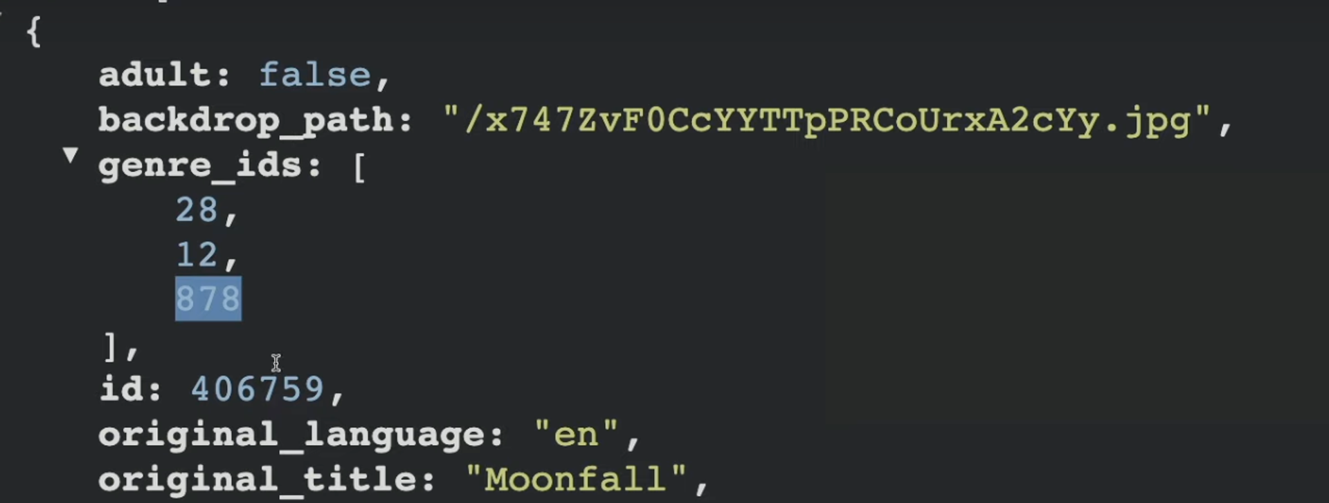 api 응답으로 영화에 대한 상세정보를 받았고, 화면에 뿌려주려고 한다. 그런데 장르 정보를 보니 화면에 뿌려줄 장르 문자열이 아닌 식별자 정보가 들어있다. 그래서 화면에 장르 문자열까지 뿌려주려면 추가적인 요청이 필요하다.