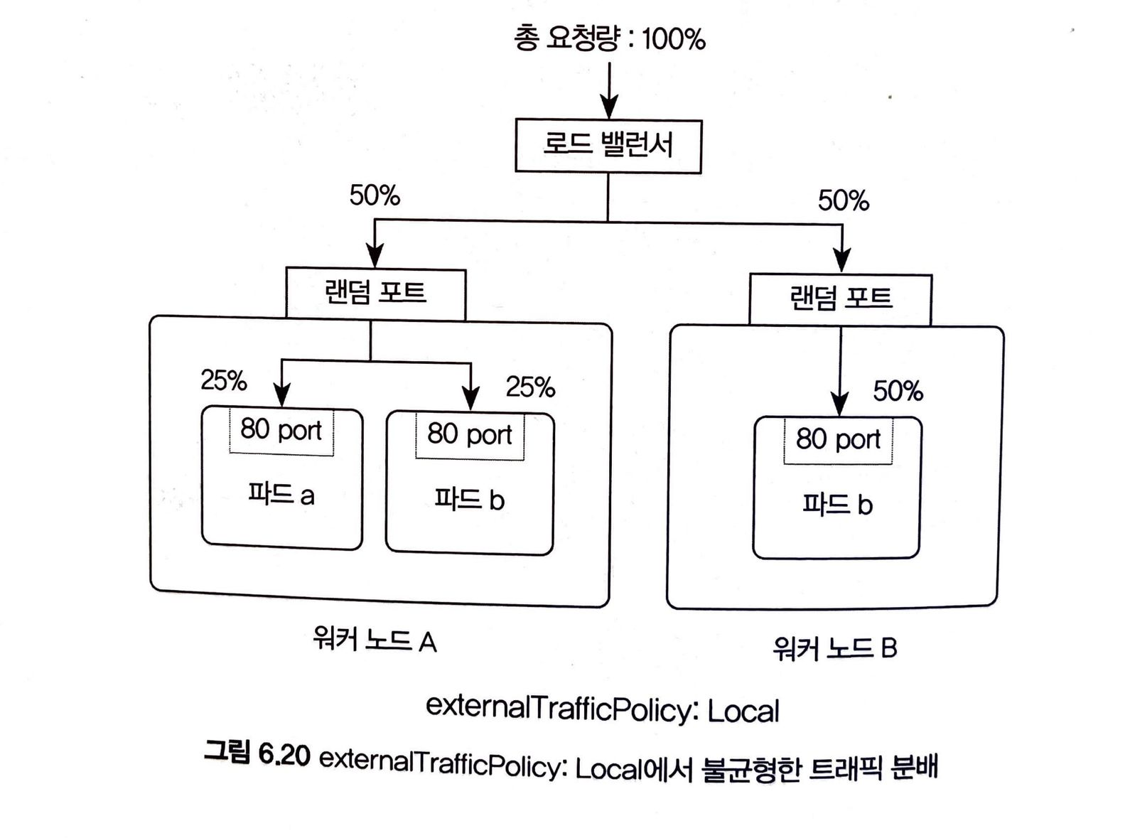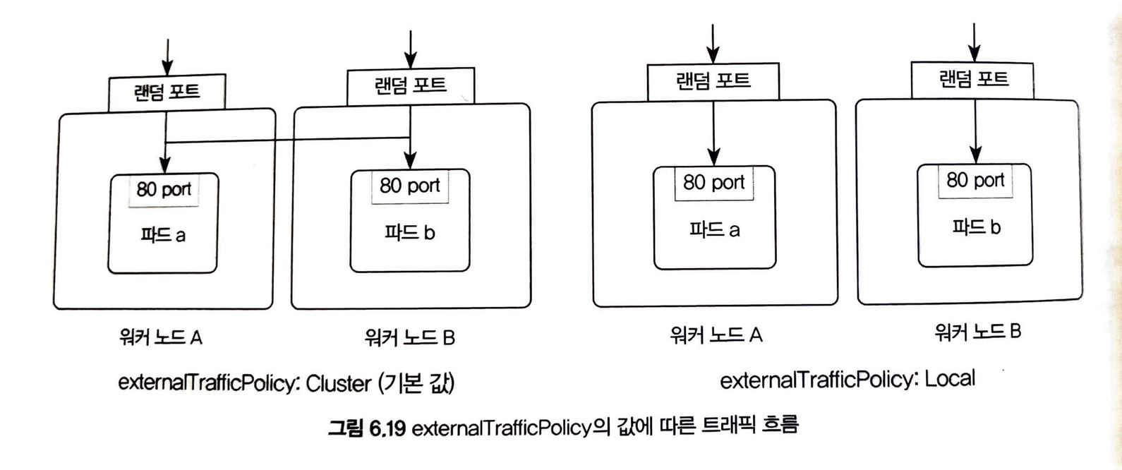 외부 트래픽은 노드 중 하나로 보내지고, 그 노드에서 다시 파드 중 하나로 전달된다. 모든 노드의 랜덤 포트를 개방하면 노드에서 파드를 선택하는 과정에서 자신 파드가 아닌 다른 노드의 파드에 전달할 수도 있다. 이렇게 되면 불필요한 네트워크 hop이 발생하고, 클라이언트의 IP 주소가 보존되지 않는다.