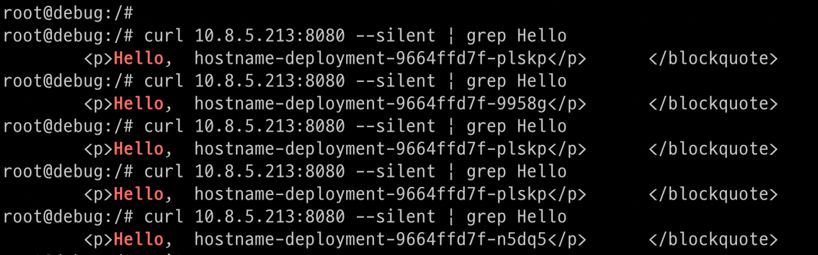 <p>Hello, hostname-deployment-**9664ffd7f-9958g**</p> </blockquote>