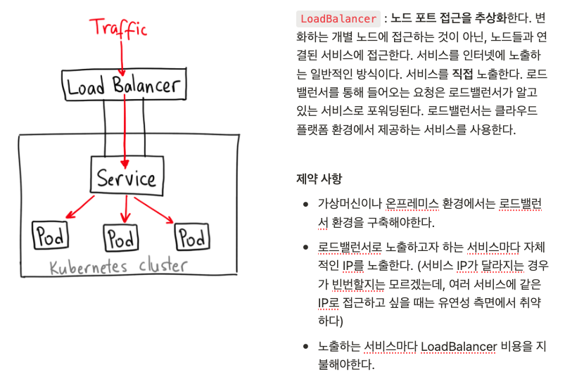 - LoadBalancer : 클라우드 플랫폼이 제공하는 로드 밸런서를 동적으로 프로비저닝해 파드에 연결하여 외부 개방, 실제 운영 환경에서 사용