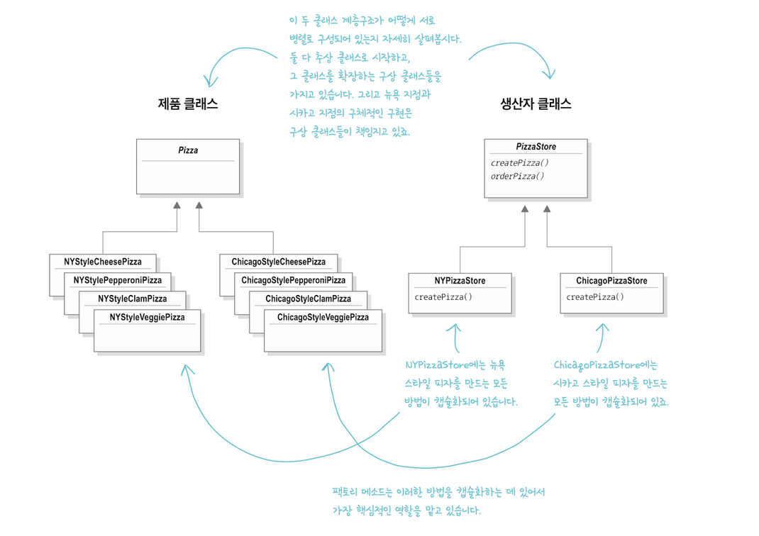 뉴욕 스타일 피자를 파는 지점과 시카고 스타일 피자를 파는 지점을 추가했다. 각 지점은 동일하게 주문을 받지만, 만드는 피자의 종류가 다르다. NyStyleCheesePizza, NyStyleVeggiePizza, ChicagoStyleCheesePizza, ChicagoStyleClamPizza 등이 있다. 이때 피자를 생성하는 부분을 팩토리 메소드 패턴으로 분리하려고 한다.