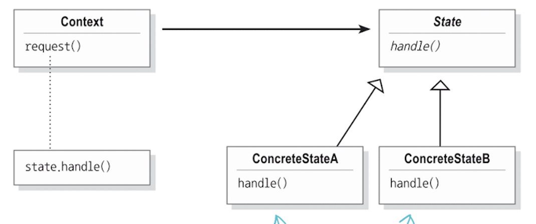 상태 다이어그램을 생각해보면, 각각의 상태를 나타내는 책임과 상태를 가지고 관리하고 변경하는 책임이 필요하다. 상태는 여러개 존재하므로 State라는 공통 인터페이스를 따르게 하고, 상태를 가지고 변경하는 책임은 Context가 가진다. 클라이언트는 Context에게 특정 행동을 하도록 메시지를 보내고, Context는 내부적으로 상태를 변경하여 자신이 할 수 있는 행동을 바꾼다.
