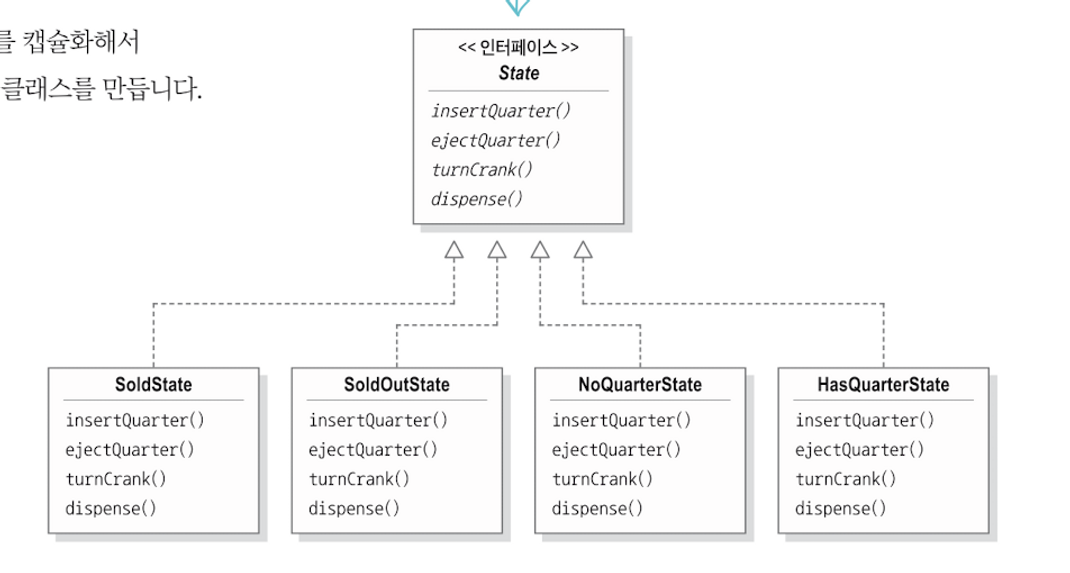 State 인터페이스에는 뽑기 기계가 각 상태에서 보일 수 있는 모든 행동의 명세를 가지고 있다. 그리고 구상 상태 클래스에서 행동을 구현한다. 이때 상태마다 구현할 필요가 없는 행동은 그냥 실행할 수 없다는 메시지를 출력한다.